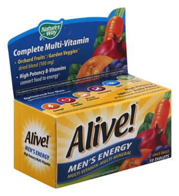 View Nature's Way Alive Men's 50+ Ingredients US. This potent and nutrient diverse multivitamin is specially formulated for men 50+. Men's 50+ once daily ultra potency multivitamin.
